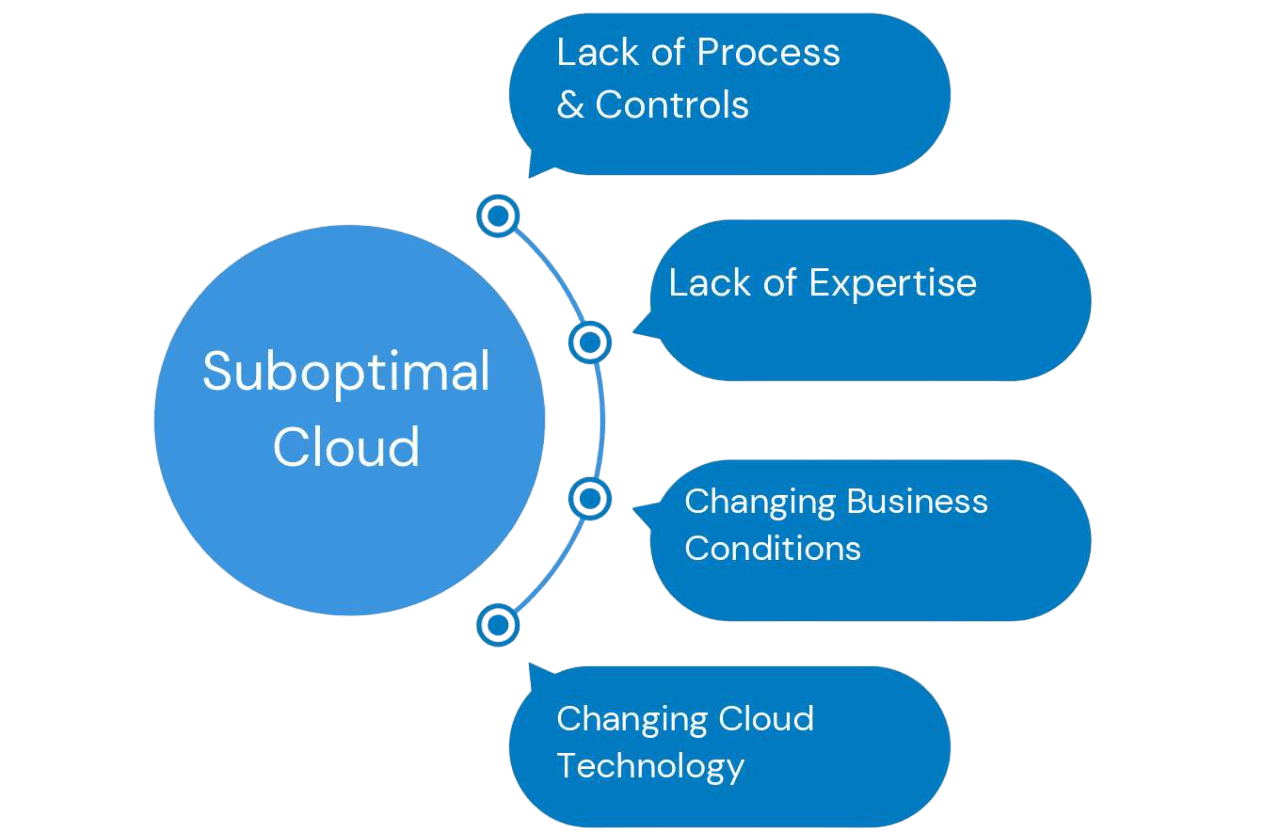Factors like inadequate processes, limited expertise, shifting business conditions, and the constant changes in business environment can create a less-than-ideal cloud setup. This might mean using too many resources without getting enough value or using too few resources and missing out on cloud benefits. The right approach involves continuously overseeing and managing costs to ensure they stay in check.